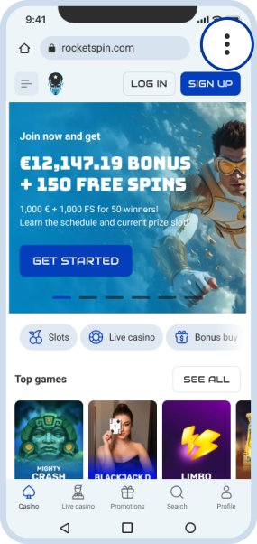Go to the Rocket Spin homepage and tap three dots to open the browser menu.